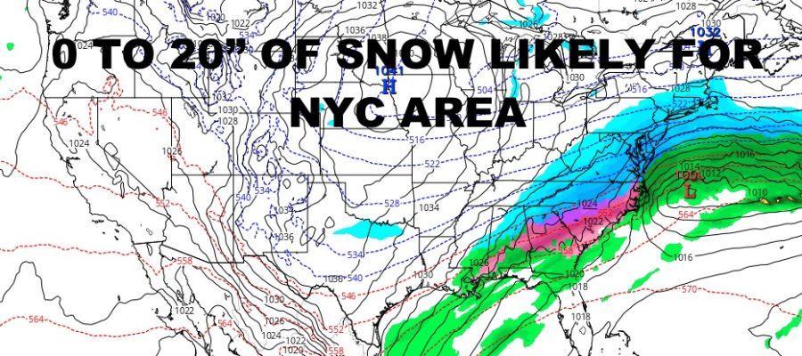 Look for increasing clouds on Saturday, then a chance of light snow overnight. Expect a 50% chance of 0-20″ of snow between late Saturday night into Monday AM, but there’s only a 25% chance of that.