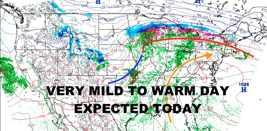 Good late morning everyone. We have some very mild to warm weather unfolding today as a warm front has been able to pass well to our north. Strong westerlies will warm us up quick, as most places are already near 70 or into the low 70’s with several more hours of heating left. After that, we get knocked down quickly for a seasonably cool and cloudier day tomorrow; then Wednesday may not get out of the 40’s.