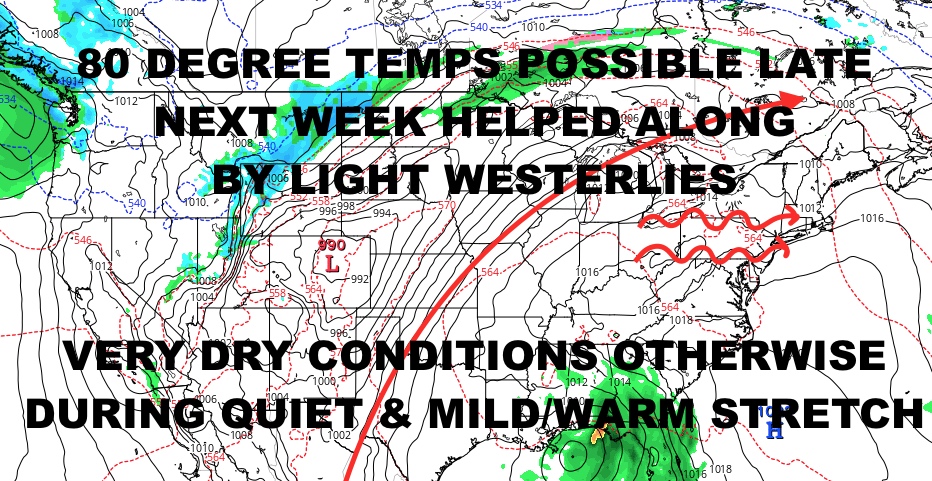 On Thursday we have a real shot at cracking 80 degree in spots with the help of sinking air and light westerlies. By Friday, we begin to juice up the air a bit as our next system begins its weekend approach. Depending on sunshine and winds, look for a wide range of temps from the mid 70’s to low 80’s; then we go into a more humid 70-75 both Saturday and Sunday with extra clouds and maybe some rain.