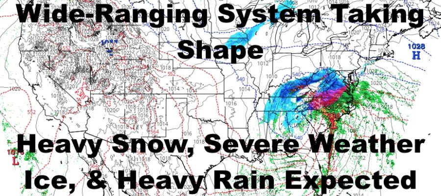 Good morning everyone. Our much anticipated system is beginning to take shape, and first in its sights will be the Southeast and Mid-Atlantic. This is going to be a doozy in terms of wide-ranging conditions, including severe thunderstorms, heavy ice accumulations, heavy snow, heavy rain, strong winds, and coastal flooding. We’ll go over it below as far as timing and what to expect.