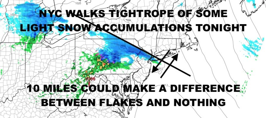 If moisture is able to cross into the area, look for some light rain mixing with, then changing to all snow overnight. The heaviest snow will be confined to NW NJ and NE PA, but it’s not out of the real of possibilities that NYC could see a coating to 2″ in a best case scenario.