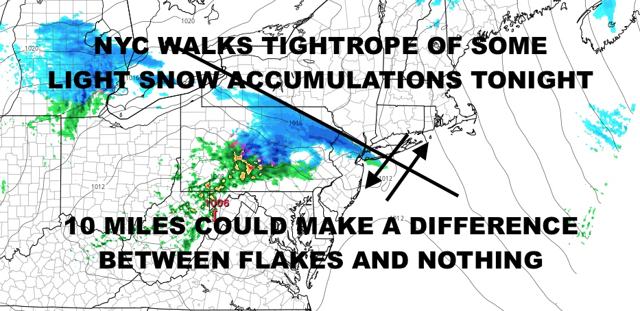 In a worst case scenario (for snow lovers), we watch the radar light up, but precip slips just to the southwest of us, making this a snowfall for places such as Perth Amboy and Sandy Hook. This is going to be a very close call and wildly unpredictable until we see what the radar does. Confidence is very low, so let’s just have fun with it and see what happens.