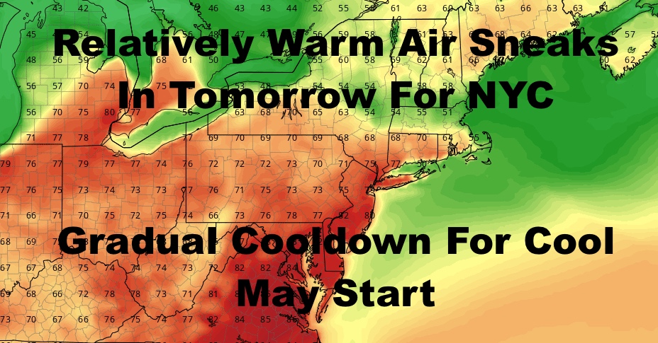 Much warmer air will sneak in, but it won’t make into the entire region. Look for wide temperature ranges tomorrow as the NYC area gets into the upper 70’s to low 80’s (cooler at the south facing shores and Forks of LI), to barely breaking out of the upper 50’s upstate and parts of New England.