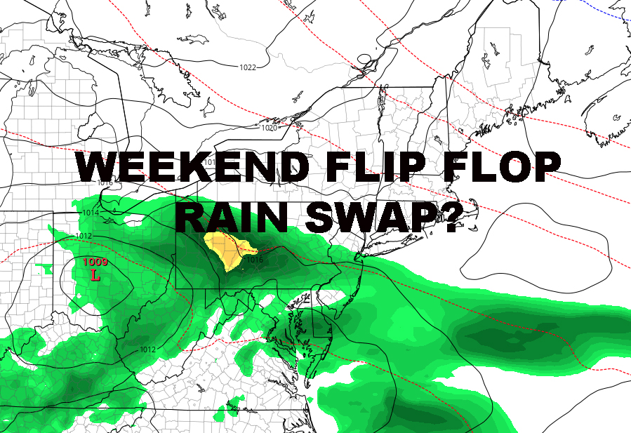 NYC WEEKEND FLIP FLOP RAIN SWAP QUESTIONS ARISE – Good morning. We awake this morning to some confusing models for the New York City weekend as far as which day will have the best chance of rain. However, at least we hold steady forecast-wise today and tomorrow to string together two nice days back to back. Last week I presented this caveat in terms of the forecast being day to day at times with this pattern.