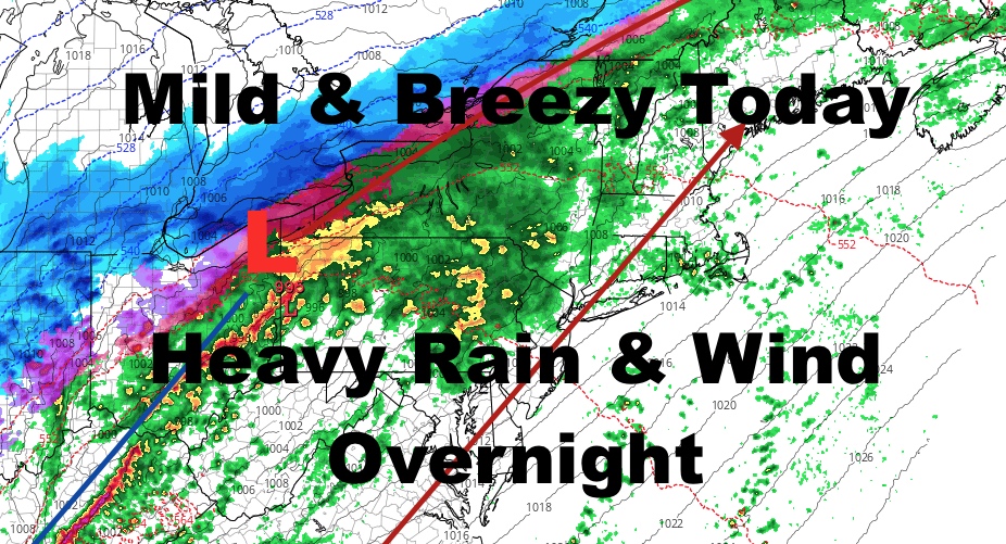 Good morning everyone. The core of the mild air is over us as we speak as are the clouds and increasing winds. That’s ahead of a very vigorous low pressure/front system that’ll bring us strong winds overnight tonight, and the chance of some heavy rain and rumbles of thunder. Behind it, not much is going on aside from a big temp drop tomorrow and a chilly weekend, but we play the game again next week with another “rhyming” system.