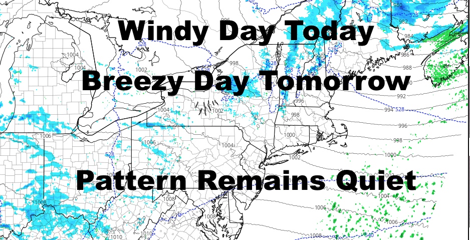 Good morning everyone. We have a blustery day in store for us today, with a chilly feel thanks to that wind. Wind sticks around tomorrow and for part of Tuesday, then we calm things down a bit as the week goes on. “Quiet” remains the name of the game as no major storms are expected in the area anytime soon.