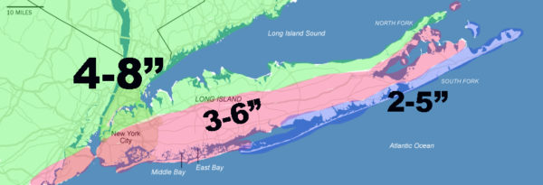 Instead of saying “3-6+’, I gave this general area a 4-8″ swath and kept a general 3-6” area through parts of Staten Island, central and southern Brooklyn, Central and Southern Queens, and central parts of Long Island/south shore of Nassau County.