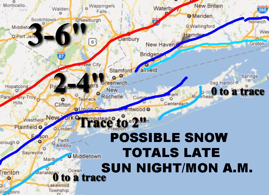 POSSIBLE SNOW NYC EARLY MONDAY – Good morning everyone! Today will be the first of a few days in terms of a taste of winter, as cold air moves in from Canada, and we keep an eye on an interesting yet complex system for late Sunday into Monday. In the immediate forecast, expect a cold, breezy day today, with the sun not helping much, highs in the upper 30’s, lows in the mid to upper 20’s at night. More or less the same for Saturday and Sunday, with highs in the upper 30’s, lows Saturday night in the mid 20’s, lows in the low 30’s Sunday night. Things get a little complicated for Sunday night, read below.