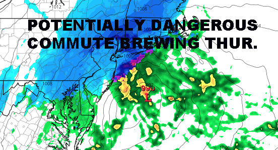 As of this moment, a potentially dangerous commute is brewing for Thursday. No, this is not “Snowmageddon” or anything record breaking. However, the extreme plunge in temperatures after a rainy and mild Wednesday, will make for situation in which we will have a layer of black ice as any standing water/slick roads will freeze; then a layer of heavy wet snow, and then a powdery snow as the lower layer of the atmosphere cools down. This will make for very dangerous travel conditions even after this system departs.