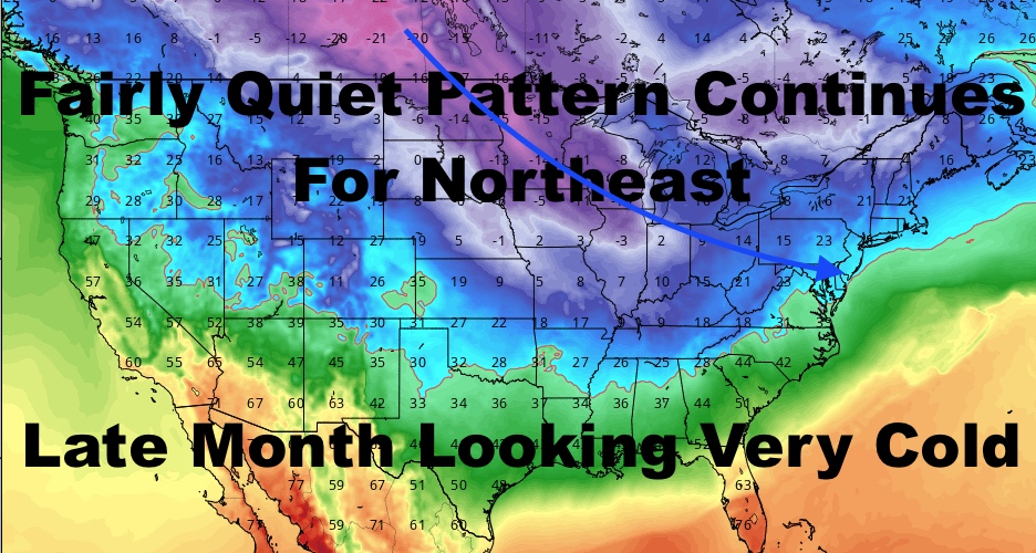 Good morning everyone. Quiet, sunny, and seasonable weather continues here in the Northeast as everything remains suppressed to our south. That pattern looks to hold on for a while until late month, where the arctic gates may open up to give us our first taste of very cold/frigid weather for the season.