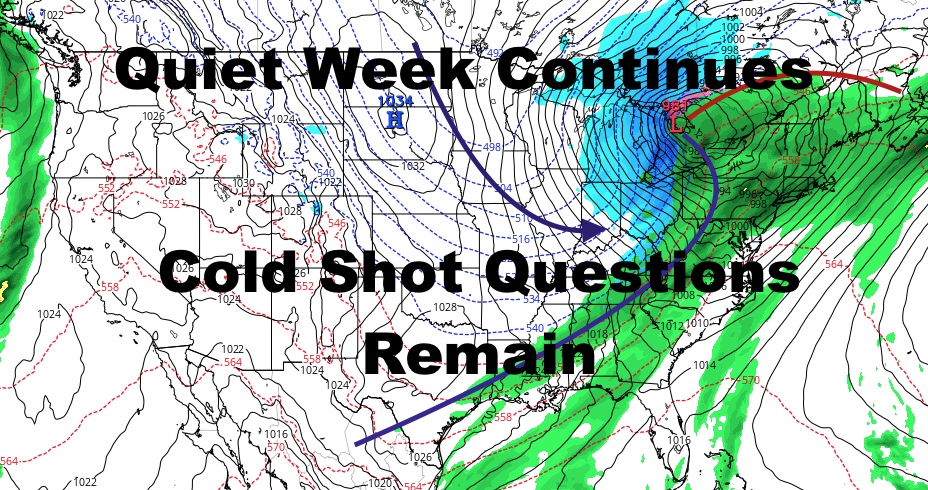 Good morning everyone. While it’s a quiet week for you, it’s rarely a quiet week for us as we’re always looking ahead for the next feature in play. That feature will be cold air looking to invade mid to late week next week. It’s looking rock solid as far as its arrival, but how long it last remains a question with our pattern changing somewhat towards a semi-zonal flow.
