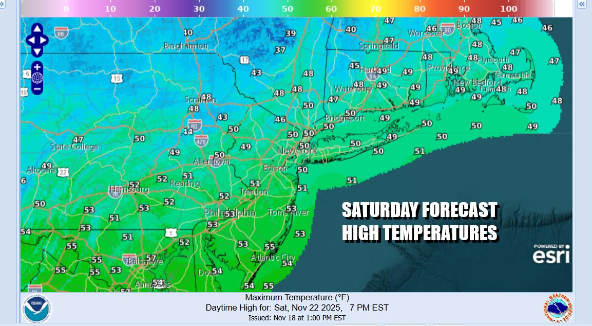 An early look at Thanksgiving day shows a cold and breezy day with clouds and some sunshine. High temperatures however will be just in the 40s and it will be even colder Thursday night and Friday as a cold air mass settles in. Friday highs may only be in the upper 30s and lower 40s with sunshine. At least we have no major storms or major precipitation events to worry about for the next week or so and certainly no worries surround Thanksgiving.