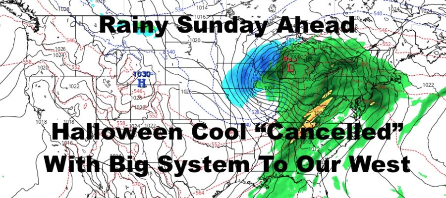 It all came down to timing and the new timing is for that system to approach the area Thursday and Friday instead of Wednesday. Not all of Halloween looks like a rainout, but we’ll see those clouds continuing to increase, then maybe some afternoon rain. Since the system will be to our west, any cool/cold temps are “cancelled” and we should see upper 50’s to low 60’s.