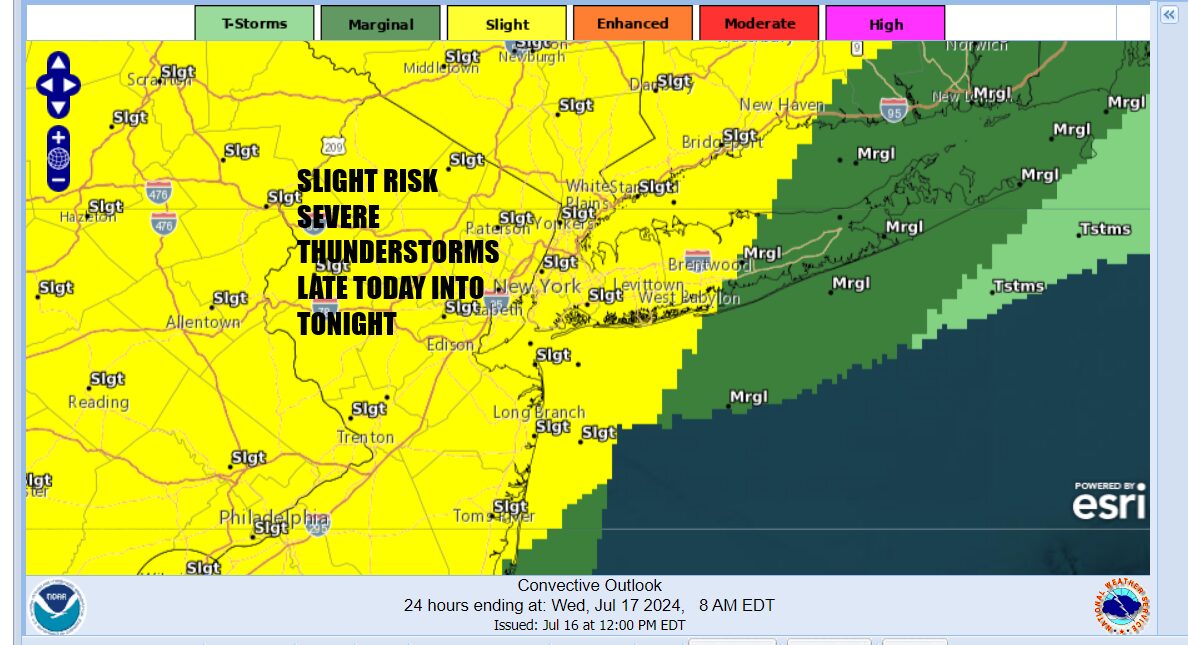 Look for sunshine for most of the day, then increasing clouds as that line nears NYC. Highs will be a toasty 95-100, and our late afternoon/evening storms could be on the very heavy side. Winds in excess of 55mph, frequent lightning, torrential rain, isolated hail, and an isolated tornado are all possible.
