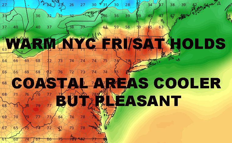 On Friday, the real warm stuff moves in and we’ll see clouds and sun, highs 70-75 in the NYC area. I know it’s very exciting, but don’t be disappointed in the coastal areas as you’ll see the cold ocean influence keep things in the 50’s out on eastern Long Island; to upper 50’s and 60’s closer to NYC along the western south shores. Same thing for Saturday with maybe some more sunshine and possibly slightly warmer temps in spots. As of now though, we’ll stay conservative and call for 70-75, cooler along the shore and eastern Long Island.