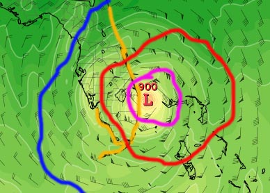 FOR EXAMPLE; If Irma is a Category 4 at landfall, these areas (purple) would experience near or at Category 4 sustained winds, with possible Category 5 wind gusts. The area in red, would experience near or at Category 3 sustained winds and possible Category 4 gusts. The area in blue would experience Tropical Storm Force winds, with hurricane force gusts possible. Remember, the storm would be approaching the southern tip of Florida and moving north, so this frame is just one position. As it moves south to north, The Florida Keys, Homestead, Miami, Ft Lauderdale, Boynton, Boca, Delray, West Palm, and areas up the coast, would all experience hurricane force winds and possibly the most powerful winds depending on the final track. ****According to current model solutions, the areas in orange (coastline), would all sustain life threatening storm surge regardless of whether the center of Irma drifts 10-30 miles east or west.****