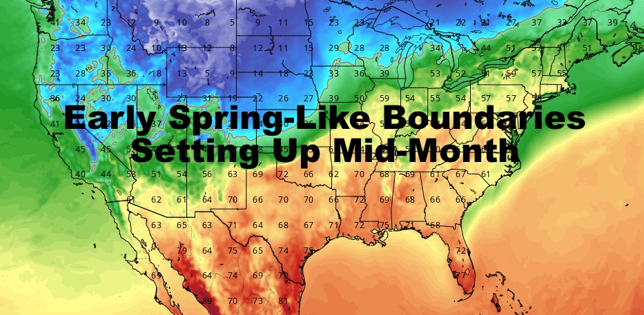 Looking into mid-month and towards spring time, I think a typical pattern is beginning to set up. Big snows or at least the potential for it, usually increases in the eastern Rockies and towards Minnesota, Wisconsin, and the U.P. of Michigan. These types of vigorous systems surge milder air ahead of them, increasing the chance for severe weather on the front end in the lower Midwest/Gulf States.
