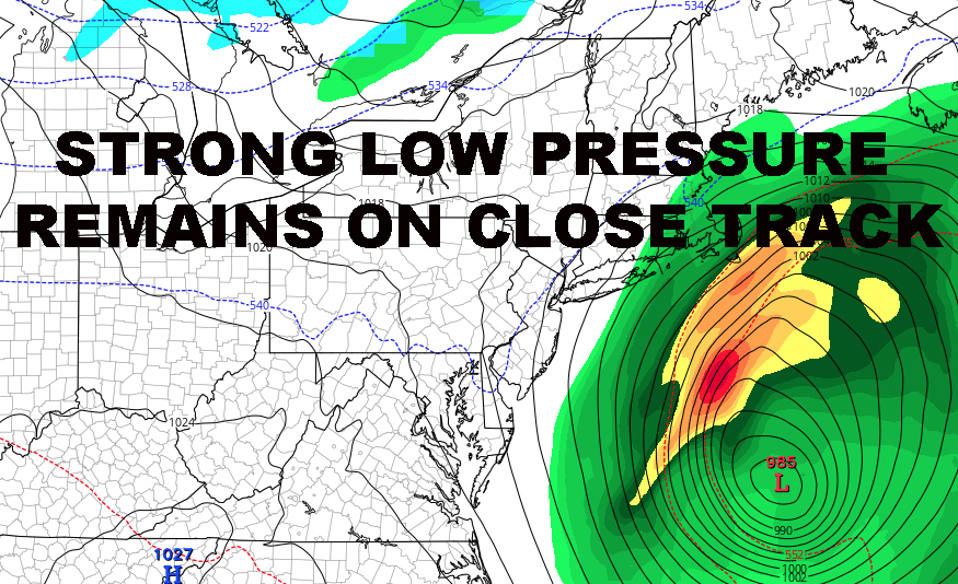 As of now, I continue to think a strong low pressure system makes a close pass to the area. It can still go slightly further inland or slightly further out to sea, but the compromise in my mind continues to see a light brushing of peripheral effects.