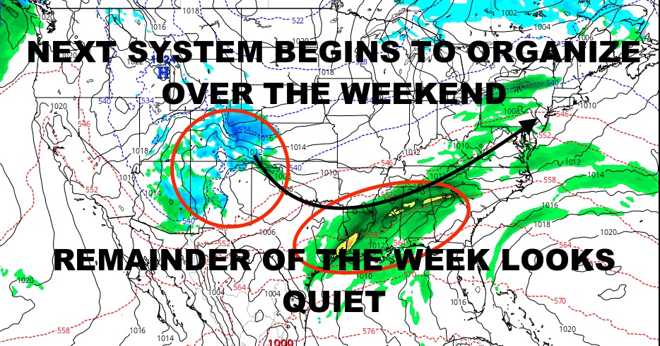One storm pulls away, another hits the West Coast, and begins to chug eastward across the Rockies and into the lower plains; and that is the theme of this winter so far. After another round of torrential rains and heavy snows for the West, we’ll start looking for more heavy rains along the Gulf as low pressure once again taps moisture from the Gulf of Mexico. As far as severe thunderstorms, we’ll have to wait and see on that; but at minimum, we’ll be looking at moderate to heavy rain this weekend in areas that have already received way too much.