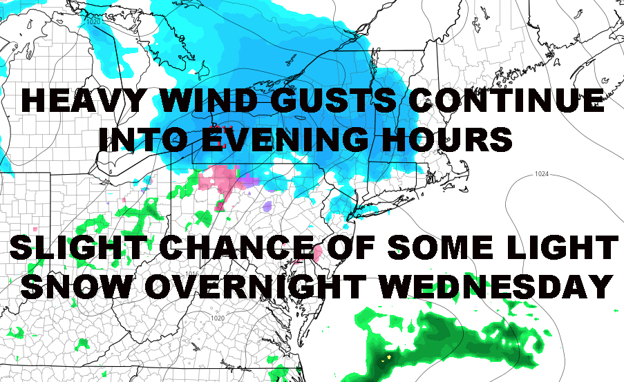 NYC HEAVY WIND GUSTS CONTINUE LIGHT SNOW POSSIBLE WED NIGHT
