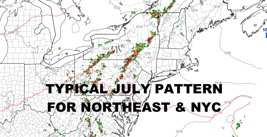 Good afternoon everyone. NYC is enjoying a typical summer we used to see in the 1980’s and 90’s with lots of warm & humid air and the risk of PM thunderstorms each day. Look for this pattern to continue over the next couple of weeks, including some hotter conditions dotting the forecast.