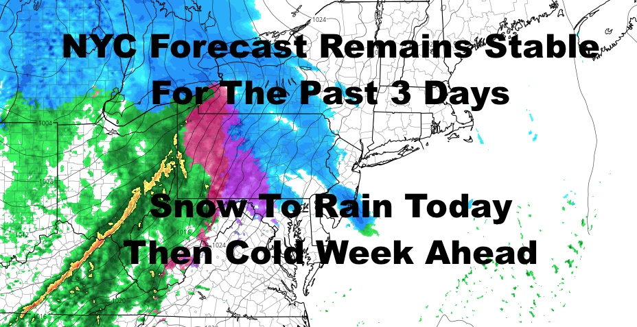 Snow changes to a mix and/or plain cold rain by late evening, and we rise through the 40’s overnight. If we don’t get any upside surprises, the 40’s overnight and into tomorrow should take care of whatever’s on the ground for NYC & Long Island. Look for a sunny and breezy day tomorrow, with highs peaking in the low 40’s early, then slowly dropping before sunset.