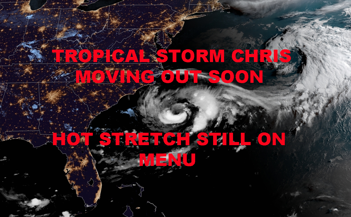 TROPICAL STORM CHRIS MOVING SOON NYC HOT WEATHER AHEAD – Good morning everyone. Another beautiful day in NYC is ahead, but it’ll be much warmer. Meanwhile Tropical Storm Chris throws a wrench in the plans for offshore boaters, but that’s about all he’ll do before he moves out soon.