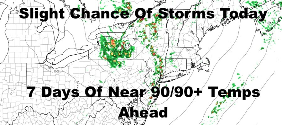 Tomorrow is looking a touch hotter, with more sunshine, the very slight chance of a storm, and highs a humid near 90/low 90’s.