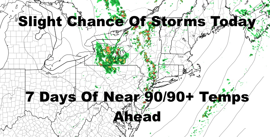 Tomorrow is looking a touch hotter, with more sunshine, the very slight chance of a storm, and highs a humid near 90/low 90’s.