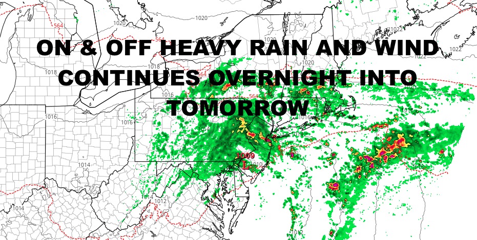 For the remainder of today, look for on and off heavy rain and a few rumbles of thunder. We are stuck in the mid to upper 50’s for a very raw day, and it reminds us of how much cool air is available this time of year given the right conditions. Winds also remain on the stiff side, with 20-30mph winds and gusts to near 40, especially at the immediate shore. We will also continue with coastal flooding issues at high tide in flood prone areas.