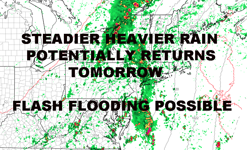 TROUGH SHIFT INCREASES NYC FLOODING CHANCE TOMORROW – Good morning everyone. Our tropical weather continues as the concentrated area of heavy rain hangs to our west, but things are about to change over the next 24hrs.