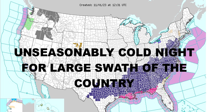 Frost and freeze warnings are posted throughout 25%+ of the lower 48, but that doesn’t mean we’re the only ones experiencing the cold. Typically, once an area has a hard freeze, the warnings aren’t posted again. So these areas you see for the most part, are the ones experiencing this cold push for the first time. Areas behind the watches and warnings are going to be very cold as well.