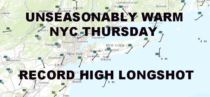 UNSEASONABLY WARM NYC THURSDAY – Several pieces of what’s left of a stretched out system, move towards the east coast, pumping intermittently warm air in our direction. The battle will be over our area, but areas inland will see record breaking temps.