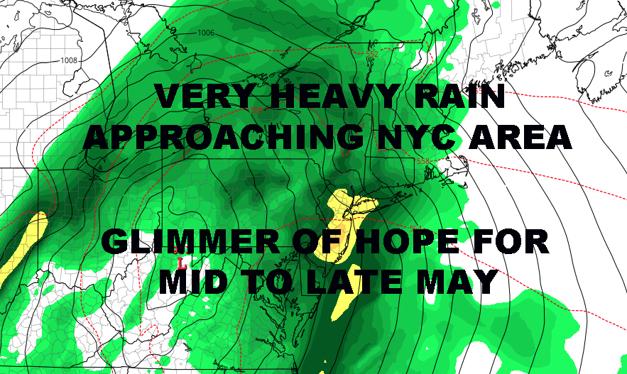 VERY HEAVY RAIN APPROACHING NYC AREA – Good morning everyone! The gloom is upon us and this is glorious weather…if you’re a duck or an ark builder. Very heavy rain is making its approach into the NYC area and with it, comes gusty winds and localized flooding in poor drainage areas. We’re pretty much at our high temp today already and most areas will see the 55-60 degree mark remain steady overnight. As the main area of heavy rain moves in, don’t be surprised to head some loud claps of thunder and a temporary increase in wind speed as well.