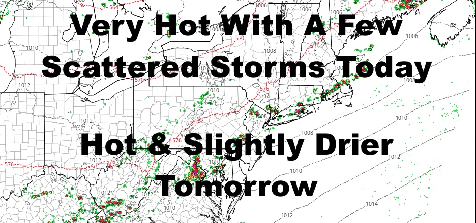 Tomorrow we go for mid to upper 90’s again, but the frontal passage will dial back the humidity a notch. Look for a sunny, very hot, a relatively drier day, with no storms to mention.