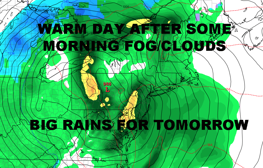 Tonight, clouds increase as a moisture-laden area of low pressure heads out of the Mississippi/Tennessee Valley and towards our area. A strong warm front and powerful east winds associated with a low pressure system, will combine for a nasty day tomorrow, with heavy rain and embedded thunderstorms, highs in the low to mid 50’s. Again, please be aware that the prospect of street flooding is very real due to the saturated ground and heavy rain. The threat of scattered showers and clouds will be with us through Friday, highs again in the low to mid 50’s.