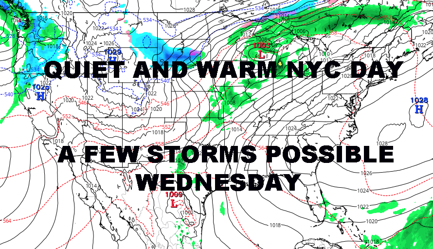 WARM QUIET NYC MONDAY TUESDAY – The warm air has officially arrived ahead of a very slow moving cold front/ridge combination. Light westerly winds will help warm things up quickly this morning through the upper 50’s and then into the 70’s as we switch the winds more towards the south, especially at the immediate shore. Away from the shore, temps will be in the 75-80 in the NYC area and upper 60’s, maybe some lower 70’s near the shore depending on how long we can hold onto that west wind.