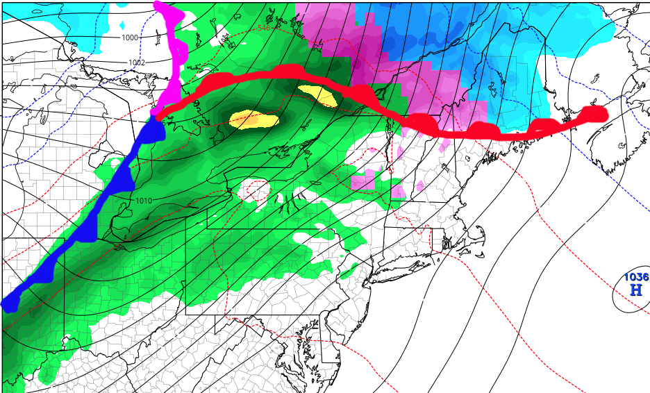 WARM WINTER NYC TUESDAY – Good afternoon everyone, hope everyone had a great holiday weekend! Let’s jump right into the forecast as we have lot’s to talk about. First off, a warm front is off to our north and west as we speak, spreading clouds, a damp breeze, and widely scattered light showers into the area. As the front passes well to our north, expect temperatures to rise overnight. After a period of some steady light rain, don’t be surprised if temps are in the low 50’s by the time you wake up tomorrow morning! Tomorrow, rain associated with a cold front will move into the area, giving us the possibility of a short period of moderate to heavy rain before noon. Highs will reach near 60 tomorrow, before dropping after the front passes and the sun returns. Wednesday will be sunny and seasonably cool, with highs in the low to mid 40’s as we sit between two systems once again.