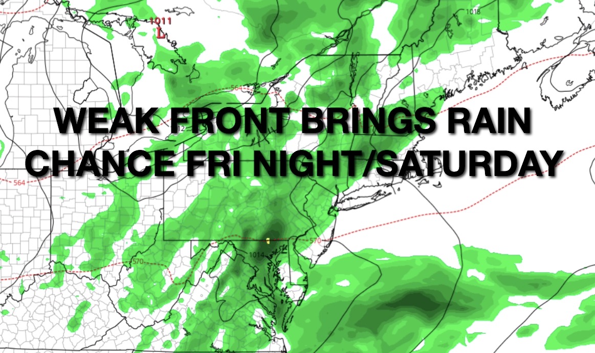 WEAK FRONT BRINGS RAIN CHANCE FRIDAY NIGHT SATURDAY – Good morning everyone. Today is another beautiful day in the mid 80’s and relatively low humidity compared to what August could be. Skies will remain sunny for most of the day, but a few clouds could sneak in later as we watch the approach of another system.