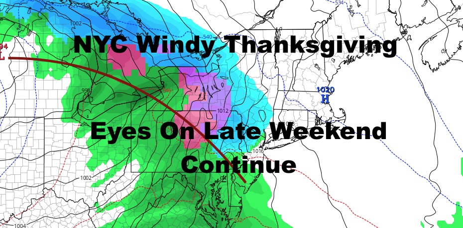 Good morning everyone. We have a showery and cloudy day in store for us today, and that’ll represent much cooler air moving in eventually. It’ll take some time getting in, but not before we have a windy day for Thanksgiving tomorrow. Meanwhile, we still have our eyes on the next system for late weekend, and I continue to not be impressed as far as frozen precipitation prospects for the NYC/Long Island area.
